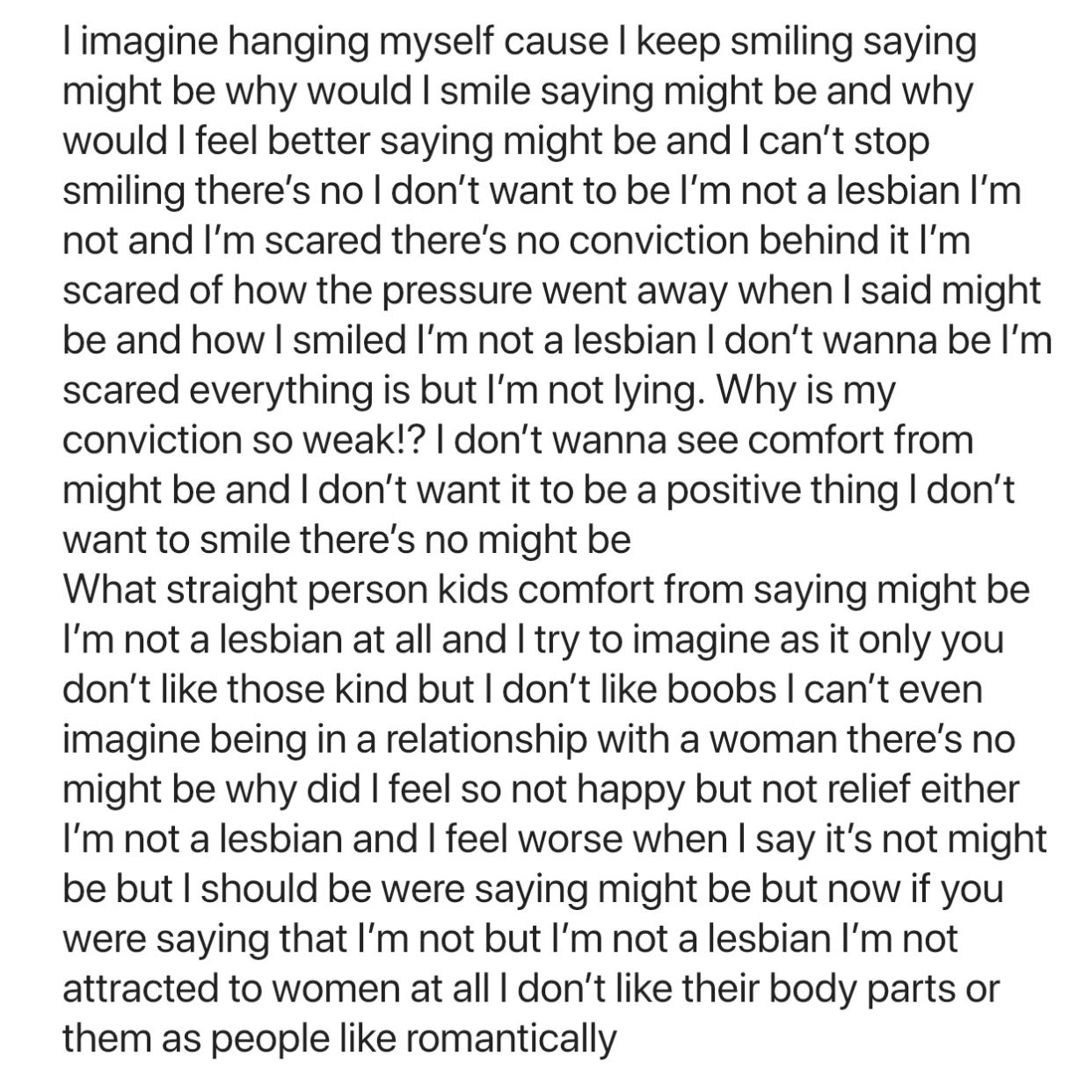Then I read the word girlfriend and I acted like my eyebrows went up like but I don’t want a girlfriend I don’t wanna hold hands I don’t want boobs and I keep saying but they’re not hotter cious I’m scared I’m just going through the motions but I’m not I can’t get past this why would I feel like that thing might be that I’m not a lesbian at all no I don’t understand I feel like screaming why do I feel worse I can’t breathe I’m not a lesbian