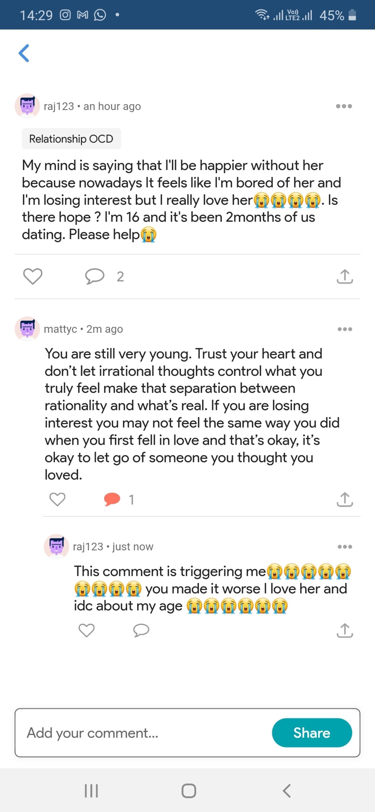 @raj123 Loganriley. See what OCD is doing? Even when you get the response you're looking for, it says 'ah but maybe she means the other comment'. OCD is masterful at creating doubt.