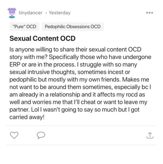 My sexual content comes with my real event, when I was 18 last year, I went on dating apps for 6 months and while using them, I sent a lot of nudes and exchanged photos with people, it wasn’t until I stopped when my OCD really picked up on it, before I felt ashamed in the sense that it’s not who I see myself as nor was it something I wanted to continue, but my OCD started adding a lot of what ifs, like “what if someone lied to me about their age” “what if you hurt someone doing this” I was incredibly naive and dumb, I still panic a lot most days, but I suppose practicing ERP and uncertainty is really helpful, also knowing that many people have done what I’ve done and is pretty common helped me a lot, false memory attaches a lot as well, it’s all horrible, but in the case for intrusive thoughts, not adding emotion or meaning to them is important, while they’re horrifying and feel awful, they’re just thoughts, thoughts can’t hurt anyone