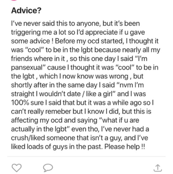 Hey you seem to have good advice i am struggling too could you help me… The last few days were good cause i was usually distracted a lot due to my exams and things but the only thing now telling me this could be ocd is the fact that 3 years ago and like till 6 months ago I panicked at these thoughts which i now think are fake and like its some way of my mind tricking me into thinking its ocd and not denial cause i made a good friend in college and she is cute and sweet and we became friends pretty quick today i just gave her a hug cause she is very sweet to me and we laugh and stuff and then this thought mixed with feeling crept in do i like her differently and i shoved it way like it was normal to me and felt like i was forcing myself to think about it later and I actually did force myself to think of it cause i am scared of it being denial so i am using all ocd tactics but was that ocd again or why did that feeling whatever that was felt real and normal and nice?!? Cause I watched a show where this girl considered herself straight her entire life spend time and hung out with a lesbian and got feelings for her and changed everything and like that she was straight before all of that it it was so possible for her and so easy how is it not for us?!? And like that too when she was 26 how do i know thats not what’s happening to me now?!? Like why does it feel like denial and like i am stopping myself am i?!?!? Its like i am trying to interpret always what my thoughts mean and feel like?!? Do thoughts actually carry feelings with them if they do thats denial right?!? Is this also something ocd is causing i am also like getting flashes of the same sex in senarios romantic or not when i think of something and I don’t take it as something wrong and why did i not types all this earlier cause it didn’t affect me was it because i considered them true?!? Like what are these sudden flashes like is that some reality did i ever truly like guys back in the day how is this not me realising some shit what if i am scared of all this cause I don’t know how the community works and its new to me cause the kind of what i felt today with the friend what was that?!? What if all this fear and anxiety is because I don’t know how to react or know how people will which is why i am a little scared but i like this feeling!!??! Is this soma kind of false attraction cause i am asking these possibilities when i should be scared of them did ocd lead me to actually denial and was it denial all this while what do i do?!? What should i hold on to?!? Also i have never had a bf and as of now dont like anyone will i ever further like someone or is this some indication of it not being denial also i forget about my thoughts after a while which more like feel like feelings and not intrusive thoughts anymore so is that forgetting a proof of it still being ocd?!? But I don’t panic as much rather fake panic to tell myself its still ocd.. i am so close to losing it suddenly why else would i get this feeling induced thoughts today even if someone tells me its ocd why does it feel like i won’t believe it would i be happier if i just accept?!? Pls help me what should i do?!! Is this even ocd anymore where should i go?! I saw a video on Instagram of a gay couple and the thought that popped in my head was do i want that?!? Thats cute?!? Is that my reality?!! Is that something i want?!? Will that make me happy and if some part of my brain says yes then what!!? I don’t think this is ocd anymore cause even if i think about the thoughts what is the explanation for feeling or did i interpret it wrong cause of ocd but why then did it feel like what i could feel for a guy which is like the last proof right?!? Why did it feel so real… this is not ocd right i am not even panicking while writing this and like normal and okay like i accept it and fake calling the anxiety so that means something right… what should i do?!? Saying the word bisexual was triggering to me earlier now i say it without panic and also when i say i am straight I fail to believe it why people with ocd know who they are i don’t feel anxiousnedd or panic what do i do ?!? Am I pretending to be someone else entirely?!? And if i say i am a part of the community will I accept that more?!? Will that feel more me ?!? Why would it?!? What part of my brain is telling all this?!? I am so lost…What do i hold on to now?!?