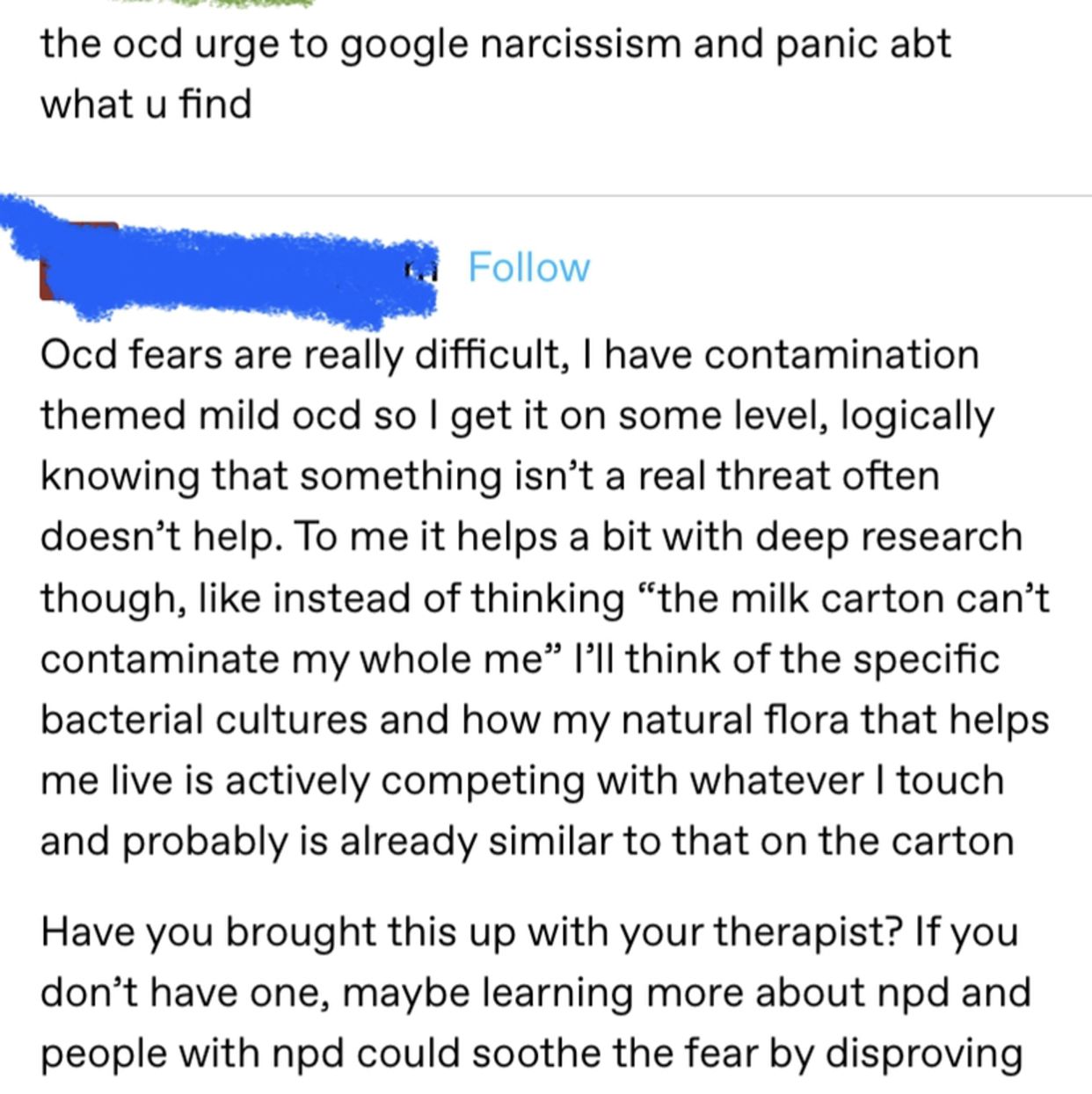 Hi friend! Although I don’t share your ocd subtype, I don’t need to to recognize how you’re freaked out by something someone else wrote. Although it might feel impossible, you will need to stay away from tumblr or any place where you might seek reassurance (including NOCD). The key here is to let yourself feel unsure about everything and go live your life anyway. Slowly but surely, you’ll give yourself permission to not figure out if you have NPD. Your brain so badly wants certainty that you do or do not have NPD. My favorite quote from Abramowitz (an ocd therapist) is to not sit with uncertainty but to act with it. Go do normal life things and try with all your might to not ruminate. You are not alone. You’ve got this.