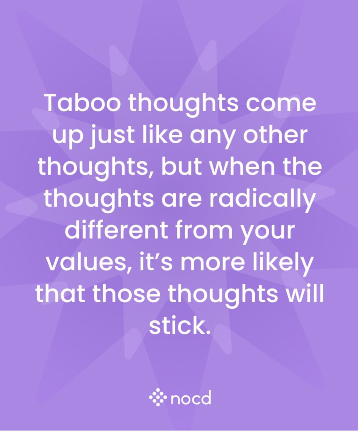 Taboo OCD is harder to talk about because what is "taboo" is often determined by the social environment. The thoughts are not only against one's values, but also against most people in their social environment. It's easy to see that this can cause the sufferer to withdraw socially -- they fear the content of the thought, but also going against society's values, and the ramifications: rejection, stigma, etc.