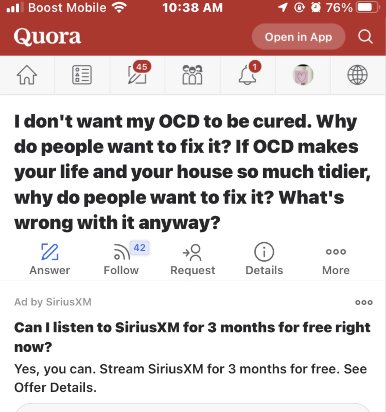 I kinda get what the person who posted this means but it's a very small view of OCD. Like I'm very organized and particular about certain things so yes, it causes my room and other aspects of my life to be clean or tidy. But the key thing here is that it causes a lot of distress. I feel like I don't have a choice. I have to do it or something bad will happen or I feel extremely uncomfortable. For most people, them cleaning/organizing is an accomplishment. They pushed themselves and am proud of the work they did. For Mr it may be a grain of that but it's mainly that "if I don't do this I'm going to go crazy so I have to." People who haven't experienced that don't usually get it. Which is good and bad I guess.