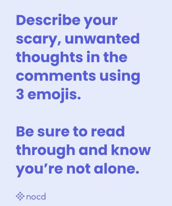 When you have OCD, it might be hard to open up about some of your scary, intrusive thoughts. Certain images, words, or phrases can be particularly triggering, especially if they remind you of your OCD subtype or theme. That's why we're challenging all of you to describe your scary, unwanted thoughts in the comments - using only 3 emojis. That way, you can push yourself outside of your comfort zone while still letting others know that they aren't alone. You can even go through the comments and "like" the ones that you resonate with, so the person knows they aren't the only ones out there having that experience. We'll go first... ? ? ?