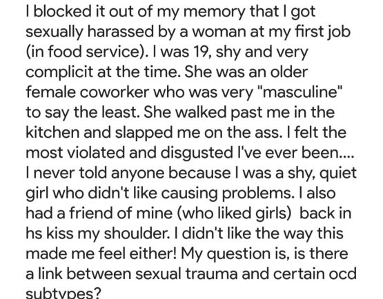 I am so sorry this happened to you, bellaahhhhh. i understand where you are coming from as these experiences really mess with your head and your feelings. the intensity of the emotions-especially disgust, is the worst to ever go through. you are not alone. i have been there. OCD can definitely pick at any trauma and those that stick with you the most. i am rooting for you. stay strong!