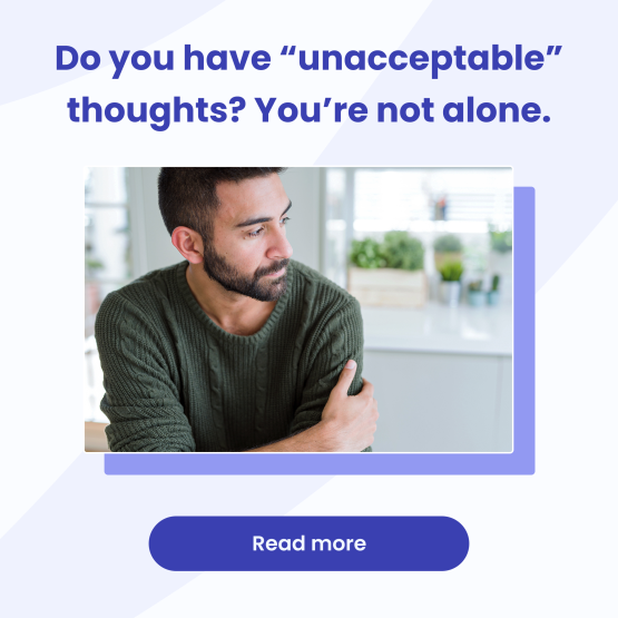 There's no limit to the intrusive thoughts, images, and urges that OCD can cause. They can attack topics from your family and loved ones to your own core values and identity. These thoughts can sometimes be violent, aggressive, or sexual in nature. As a result, people with OCD who experience thoughts they feel are "unacceptable" or taboo find it hard to share their experiences with others, and so many people often end up suffering in silence. If OCD is giving you thoughts, images, or urges that you find "unacceptable," you aren’t alone, and you don’t have to suffer forever. All themes of OCD are highly treatable, and you can learn to gain self-compassion and live with confidence in your values. Read more about how you can get on the path to recovery from OCD, even if you’re experiencing disturbing thoughts.