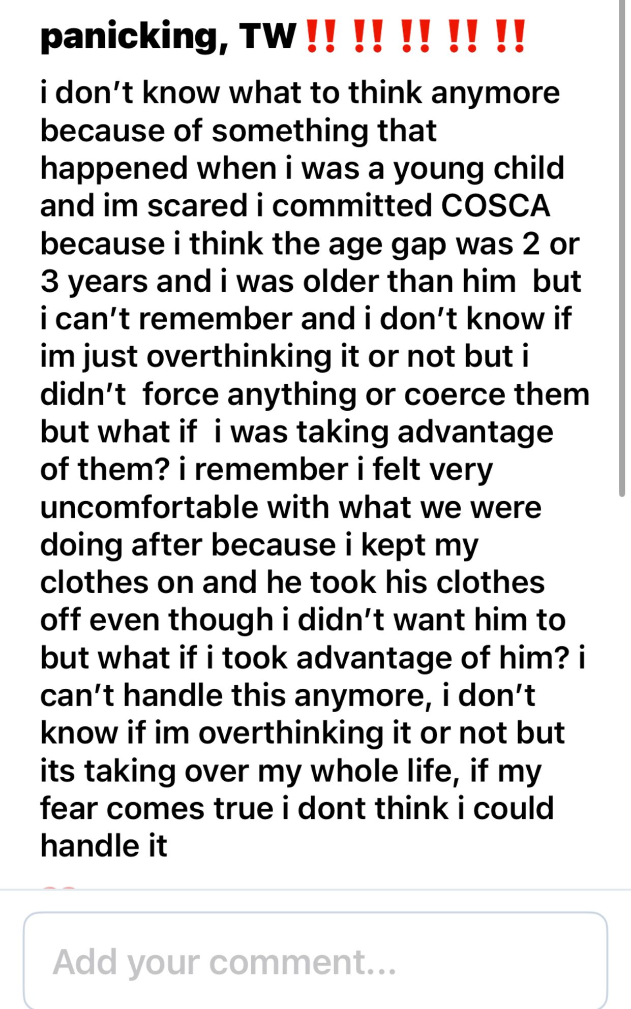 @OCDisQUICKSAND itâs child on child sexual assault and im scared if i have but people around me told me i havenât but maybe im overthinking it i dont know but im panicking