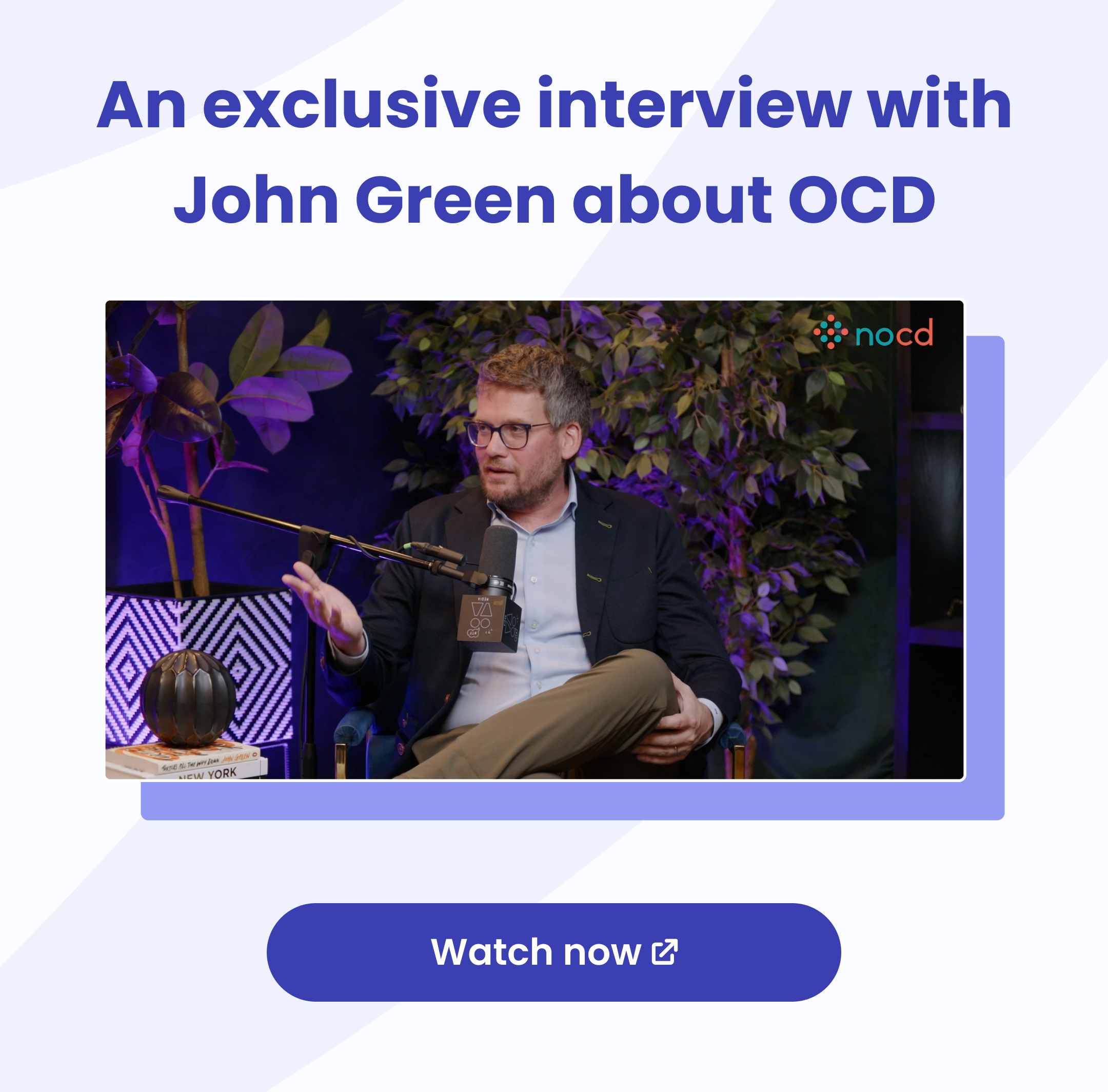 Looking at John Green’s success as a bestselling author, philanthropist, and YouTuber with nearly 4 million subscribers, you might be surprised to find out that he used to lose eight hours a day to compulsions, or that he once thought he’d never escape his OCD. But he did, and he speaks about it openly. In an exclusive interview with NOCD’s Chief Clinical Officer Dr. Patrick McGrath, John reflects on his lifelong battle with OCD, what he wants people to understand about the condition, and the incredible changes he’s noticed since managing OCD thanks to ERP therapy. We at NOCD are incredibly proud to partner with Green to educate people about OCD, combat misinformation, and help them get better through exposure and response prevention (ERP) therapy with an OCD specialist—the same treatment that helped John get his life back. Read our full interview with John Green.