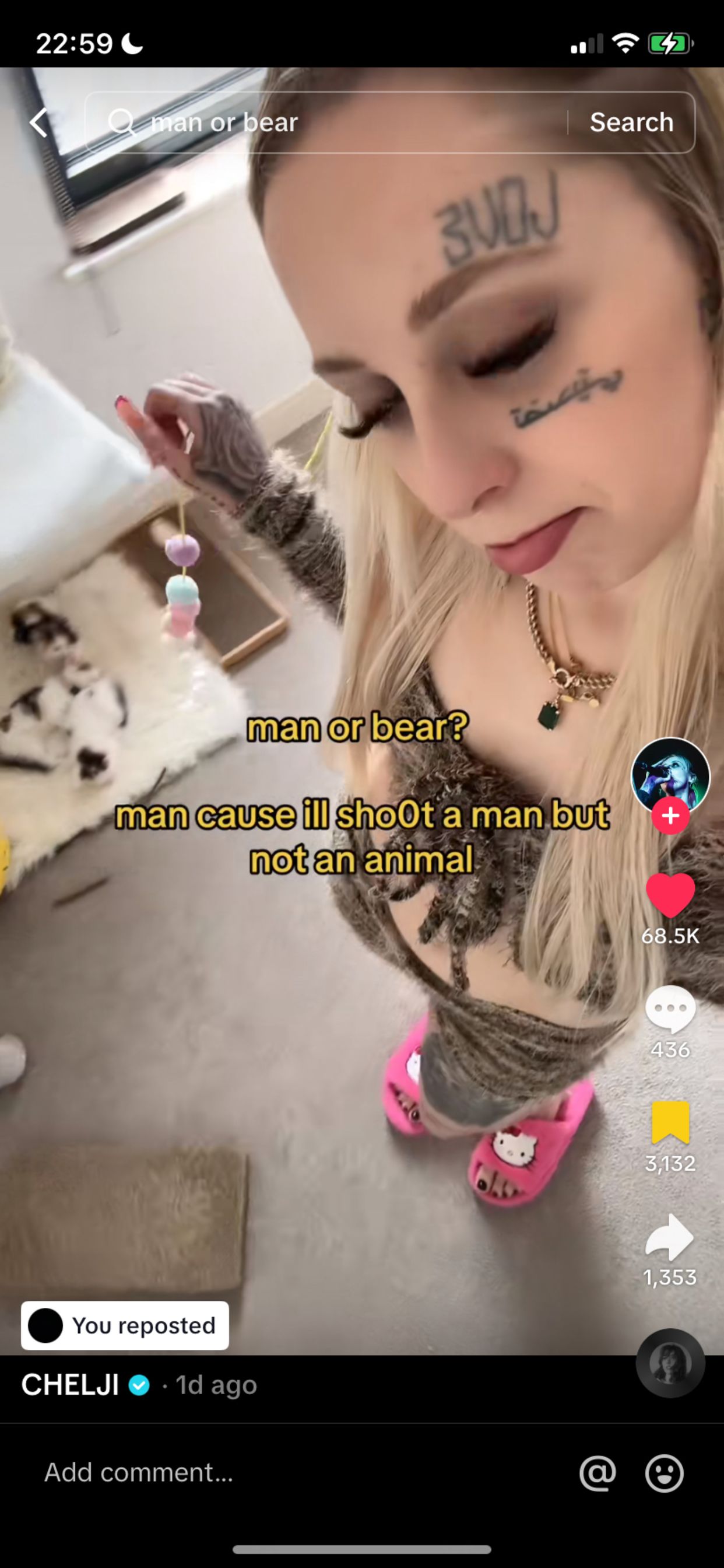 I just reposted this on my TikTok but feel like I need to unrepost it (I do this with every post and it has to feel right and like it’s in the right place) but I started getting thoughts because I know my bf is going to see it like I don’t want him to think it’s about him and I’m getting scared it’s going to hurt his feelings Because obviously I would never shoot a man but it’s making me think does that mean I would and that I’m a bad person for reposting like I’m getting scared that I want to hurt him or something But it’s just a TikTok thing that’s going round about the “man or a bear” But now I feel like a bad person for having an opinion but I never commented on this trend before