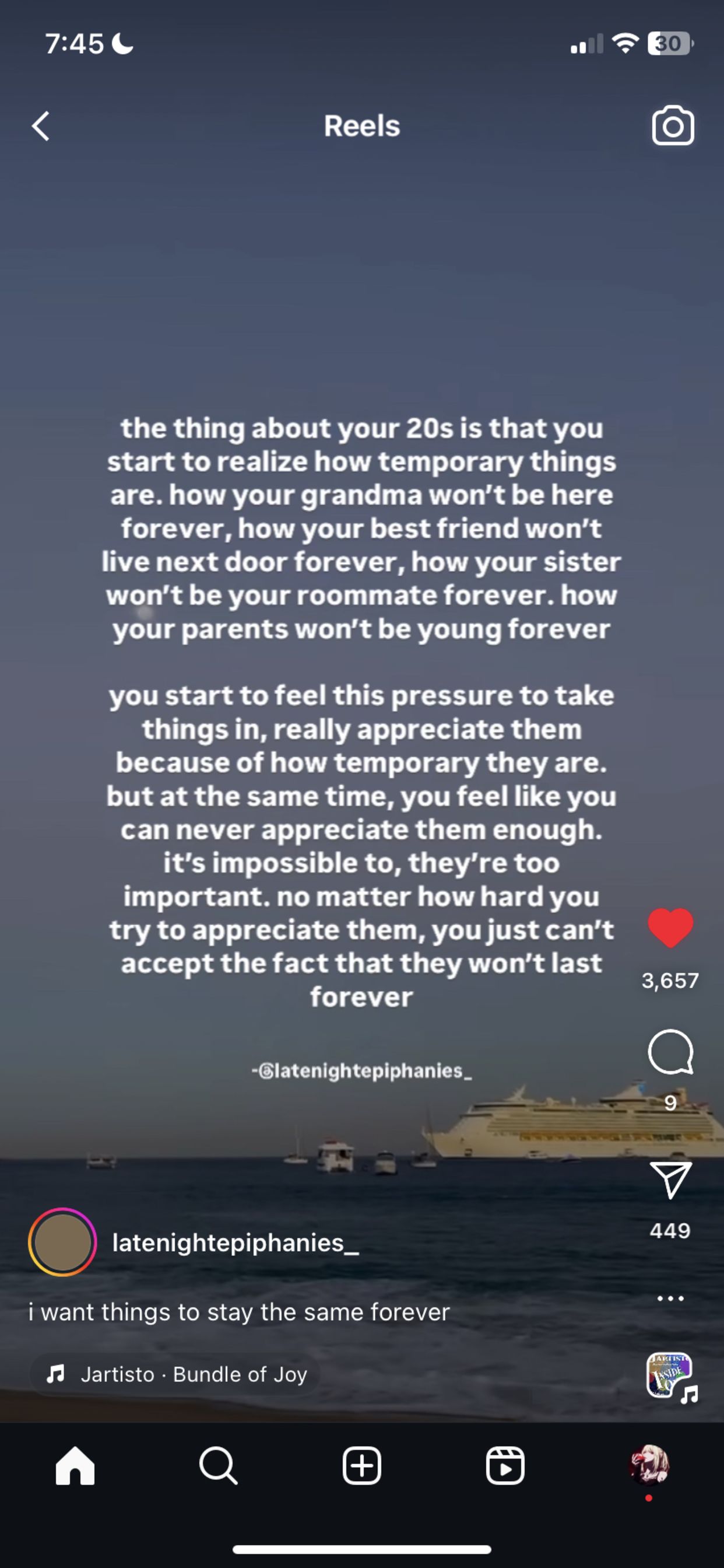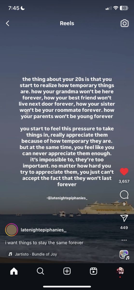 these thoughts are some that i obsess with and i'm trying so hard to overcome this current fixation on those thoughts but when i see videos like this appear on my feed, it makes my existential and magical thinking ocd really hurt. because like, it makes me think this is a sign and that something is wrong. i feel guilty for obsessing over these thoughts because i know i will rightfully regret these thoughts but i don't wanna think about eventually regretting it because that means thinking of the future and i fear the future. and fear time passing fast. i don't want the next 30-40 years to go by like the blink of an eye to to zoom by. i want it to be slow and i don't even wanna think about it. but it's so hard. my mind always thinks. i feel guilty when i don't think about the thoughts because it makes me think i don't care but i feel guilty when i think of the thoughts because they consume me until mg head feels fogged up and irritated. sometimes until it feels like a rubber band is going around my brain/mind itself. ugh