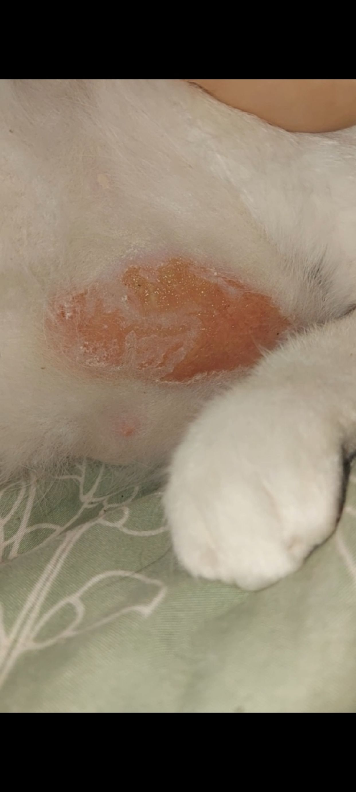 My cat has a hot spot on his belly, mom thinks it's from his belly dragging on the floor when he's hunting. (He's an indoor cat.) My mom struggles with SPENDING money. But please someone tell me what I should do. It was once a small patch, I've been putting corn starch on it multiple times a day, stopping him from licking it, but I can't see everything. I just bought a cone for him, and he's been insistent on licking it. I've been begging for a vet visit but my mom pushes everything off. Hopefully the cone works. Advice would be appreciated (Picture has corn starch + flash, it's also wet)