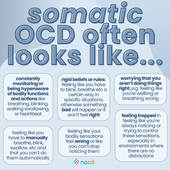 Somatic OCD, also known as Sensorimotor OCD, can be difficult to spot and might feel very confusing: It tends to revolve around a fixation on specific bodily functions or sensations, leading to a preoccupation with them. This might look like constant monitoring, feeling like you need to manually do things (like breathing) that would typically be automatic processes, or it might even involve magical thinking and show up as rigid beliefs and rules about how to do certain things. Have you ever experienced Somatic or Sensorimotor OCD? What does it look like for you?