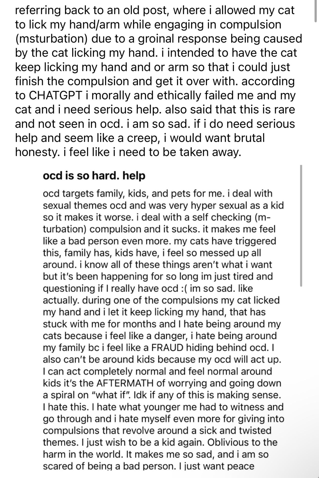 sorry for repost. I don’t know if people aren’t answering because they think im weird or gross. but here I am going to upload a post that I made, it has contents of trauma, sexual themed ocd, zoophilia ocd. I need some help, or advice on how to forgive myself or if I should even forgive myself? Some actions are unforgivable, for example (abusing animls, pdo philia , r4pe) and I’m scared that I am unforgivable and irredeemable. This compulsion happened a couple times. I’m scared I morally failed myself and my pets Here’s the post: