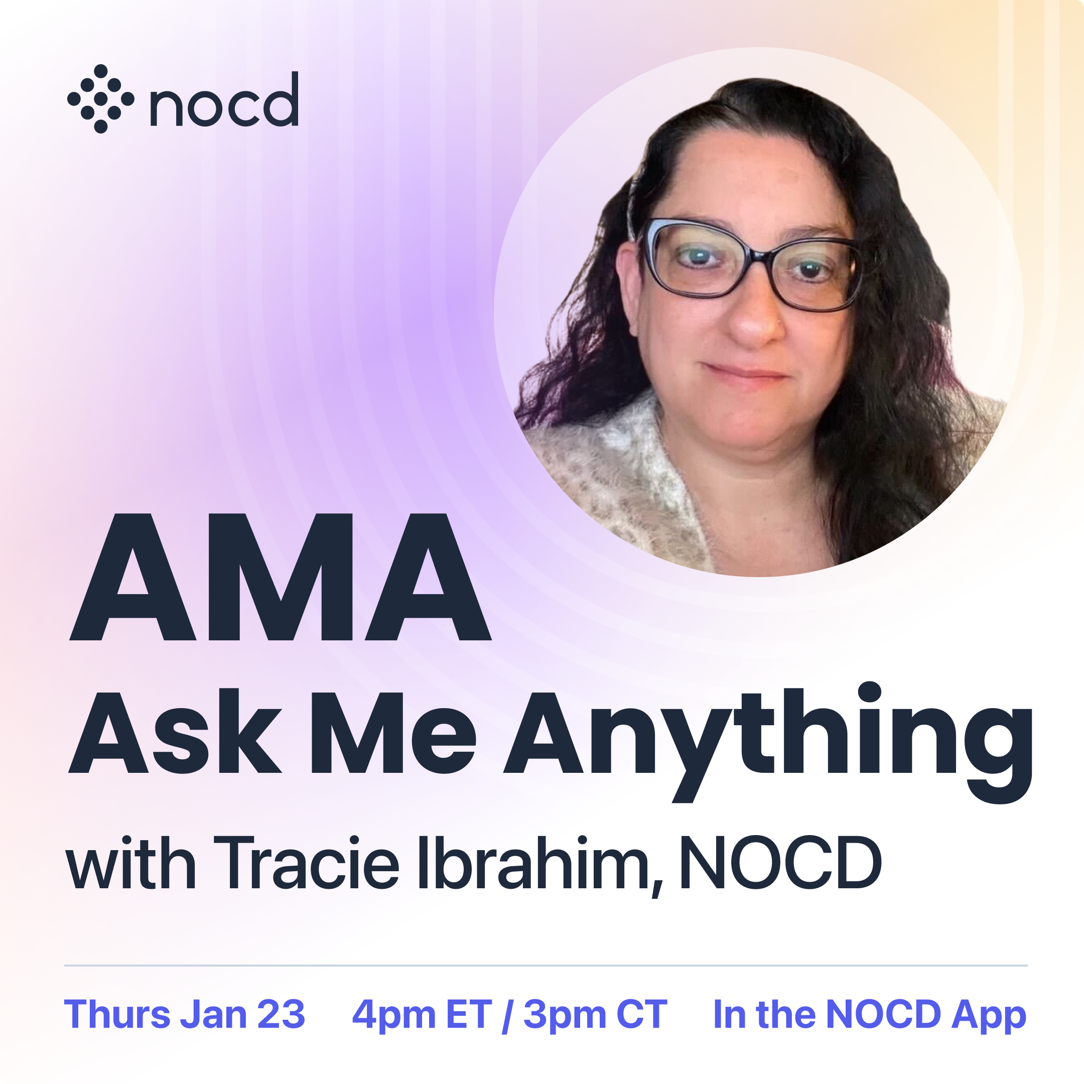 Join a special AMA (Ask Me Anything) right here in the NOCD Community to ask Tracie Ibrahim your questions about OCD, treatment, taboo intrusive thoughts, advocacy, or anything else! After spending 9 years cycling in and out of almost 30 mental health facilities where her OCD was repeatedly misdiagnosed and mistreated, Tracie became a fierce advocate for OCD awareness and evidence-based care. Now, as NOCD’s Chief Compliance Officer, she’s using her experience to ensure everyone who reaches out to NOCD finds the understanding and effective treatment she wishes she had back then. Submit your questions for Tracie in the comments below and she’ll respond to as many as she can during her AMA. 📅 When: Thursday, January 23 at 4 PM ET / 3 PM CT / 1 PM PT 📍 Where: In the NOCD app ❓How to ask questions: Comment below!
