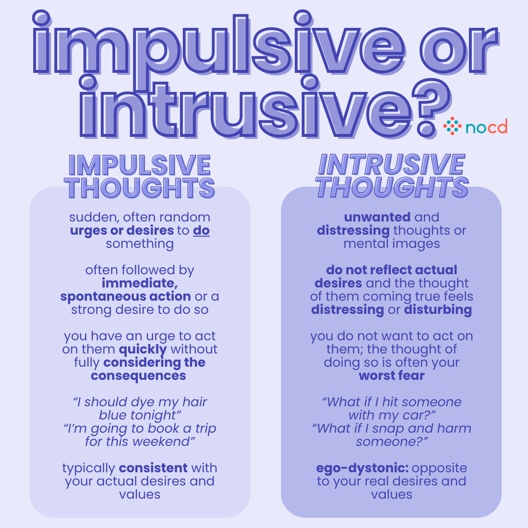 There’s a big difference between impulsive and intrusive thoughts, and confusing the two can lead to misunderstandings and misinformation about what intrusive thoughts actually are. Impulsive thoughts typically reflect our real desires, even if their consequences may not always be ideal. Intrusive thoughts, on the other hand, are things that we absolutely do NOT want to come true. They’re typically the total opposite of our actual desires, and acting on these unwanted thoughts is often the worst fear of those struggling with them. While nearly everyone experiences intrusive thoughts, if they’re causing you intense distress and affecting your quality of life, or you find yourself trying to get rid of the distress by engaging in ritualistic behaviors or thought processes, you could be dealing with OCD (obsessive-compulsive disorder). If you want a better understanding of how to deal with your intrusive thoughts, NOCD can help. Use the link in our bio to book a free call and get matched with an OCD specialist today.