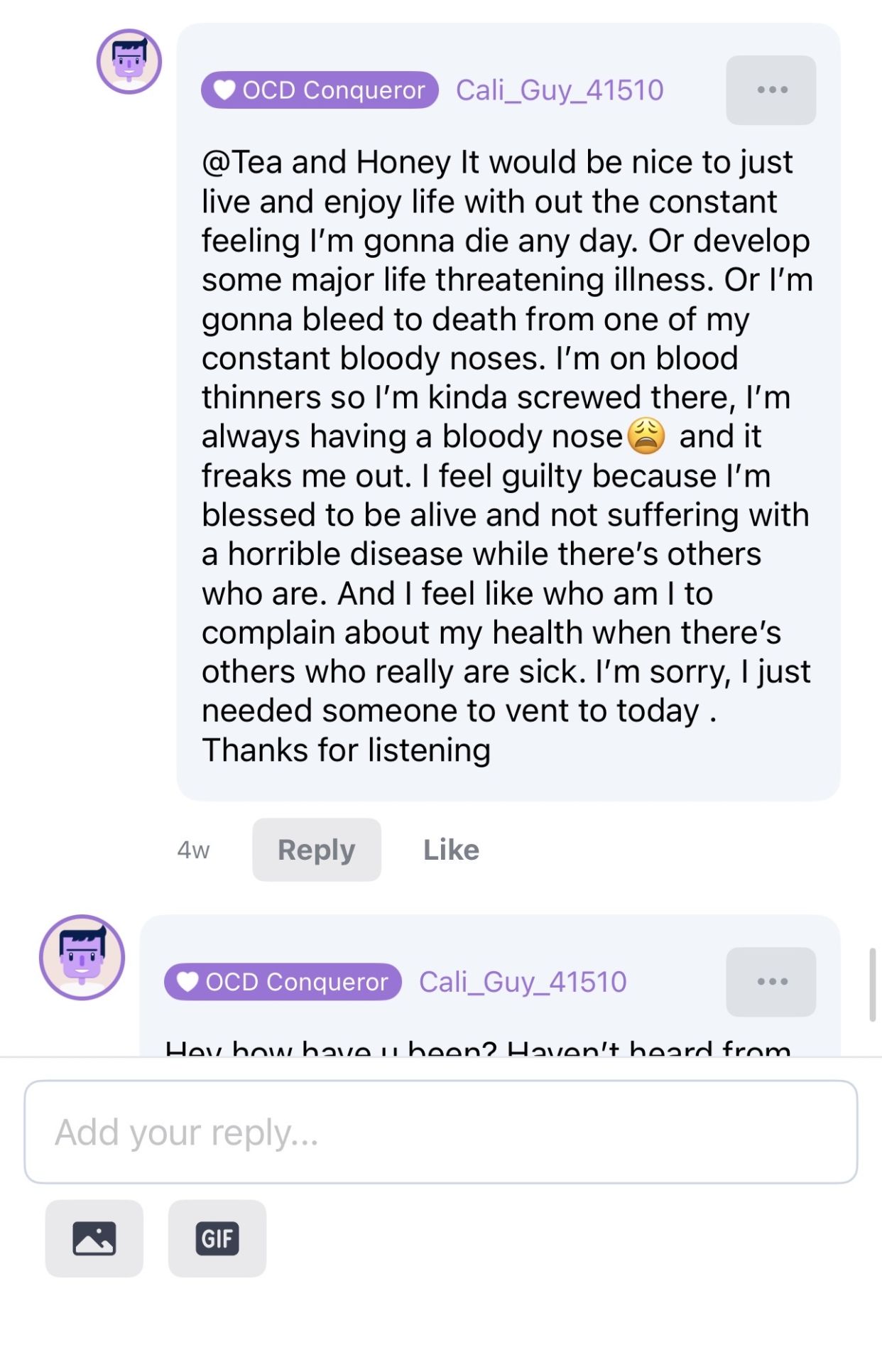 @Tea and Honey Ok. Iāve been dealing with my health ocd pretty bad lately. Causing a lot of depression and anxiety