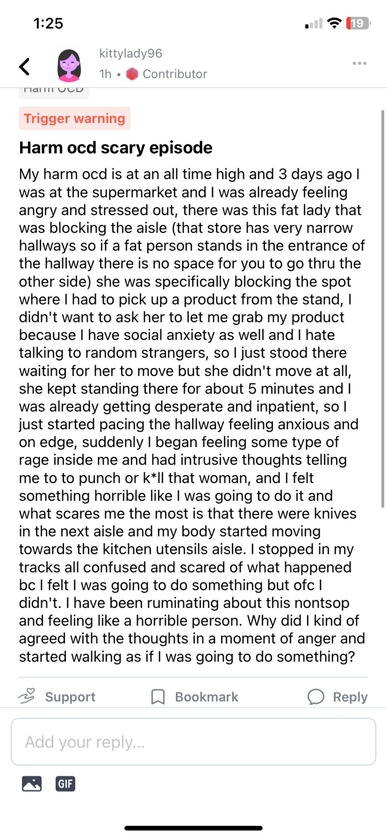 I have been experiencing the exact same sorts of things. And lately, I've been realizing that what you are describing is really the foundation of how OCD works. Please give yourself grace!! I've been in that position hundreds of times. And here's the thing. You are a victim of the OCD. You are suffering in your mind in an immense way. People who don't have OCD dont understand the depth of the suffering. I wouldn't wish my OCD experiences on anyone. Here's what I am learning lately. OCD has certain ways of dealing with us. And we listen to it!! And once we can recognize it's strategies, we can defeat it. Here's a book you might consider: I haven't read it, but I have read things about it and it looks really good. https://thestrugglingwarrior.thrivecart.com/listen-up-ocd-is-talking/ But the bottom line here is two things: 1.) don't feel bad that your anger sparked intrusive thoughts about the lady. That's how OCD works! That's what OCD does! But the lie is that you are responsible for your thoughts. You are not! The truth is that the thoughts don't actually mean anything!!! I'll send you more info on this 2.). The second thing is that the urge to go toward the kitchens isle is part of OCD. These urges happen to me all the time. Every day, in fact. I also read about others on this app talking about this all the time. So don't feel guilty that you started to follow the urge. That's just what happens. There is nothing to worry about. We will always follow the "mini" urges because we can't help it. But we would never do the big things (like actually pick up a knife). ---------- What would really help you is ERP therapy. I'm going to send you more info. Please feel free to message me any time! I want to help you! I can see that you are suffering. But you are experiencing very typical OCD. And there is very good treatment out there with ERP therapy!