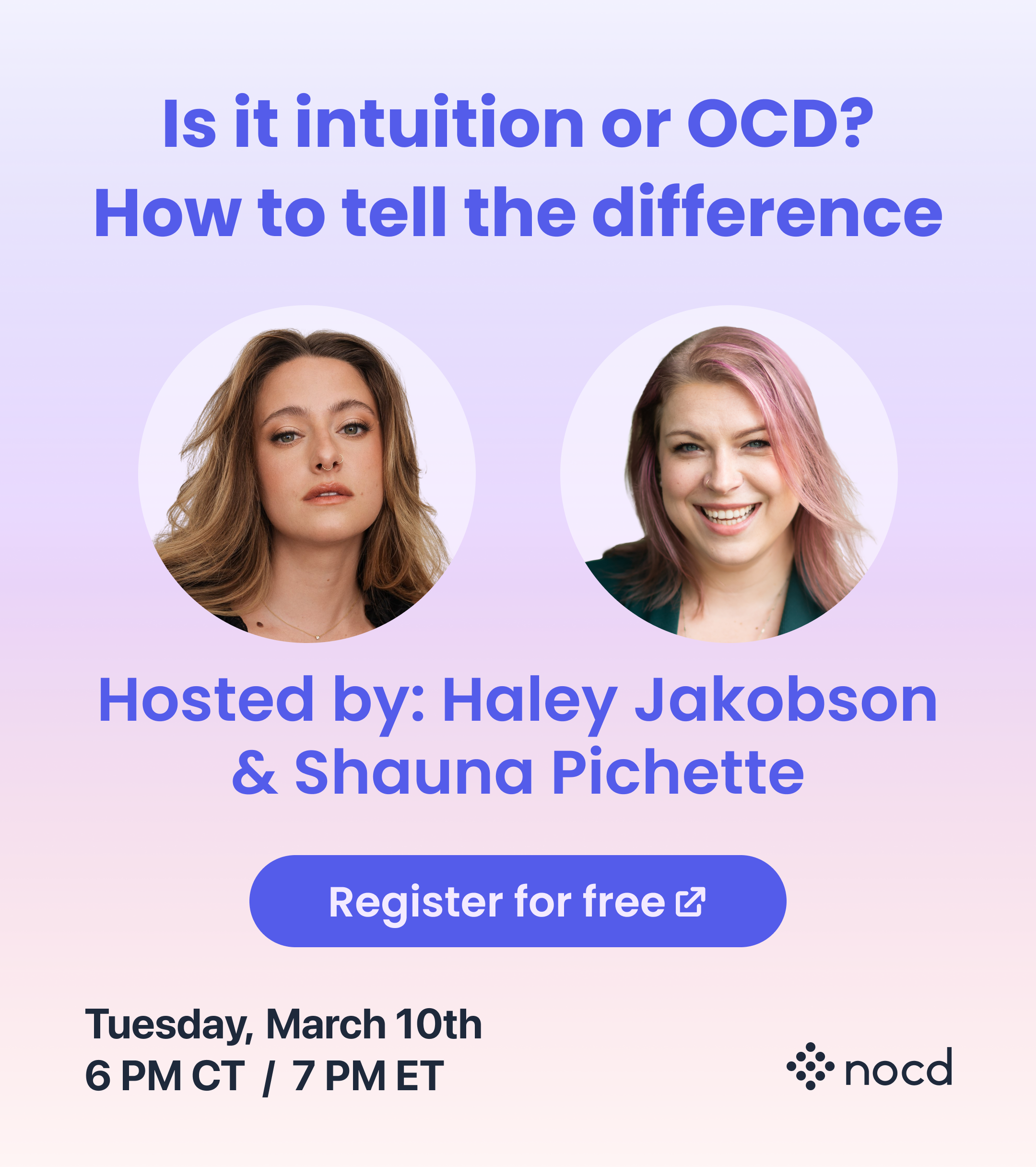 Author and mental health advocate Haley Jakobson used to believe her intuition was guiding her choices. Every “gut feeling” felt like a command to take action. If she didn’t listen, she was convinced something terrible would happen, and she would be responsible. In reality, however, the urgent, unrelenting voice controlling Haley’s life was OCD—and learning to recognize it changed everything for her. Now, Haley is joining NOCD Therapist Shauna Pichette for a free, live event about how OCD can disguise itself as intuition, and how the right treatment can help you connect to your true values. 🕝When: Tuesday, March 10 at 6 PM CT / 7 PM ET 💻 Where: On Zoom ⭐ How to register: Learn more and sign up for free here: https://nocd.zoom.us/webinar/register/4117583006440/WN_HoRiYWnFRKGaQvW_eJKHlw This event will be recorded, and the recording will be sent to everyone who registers.