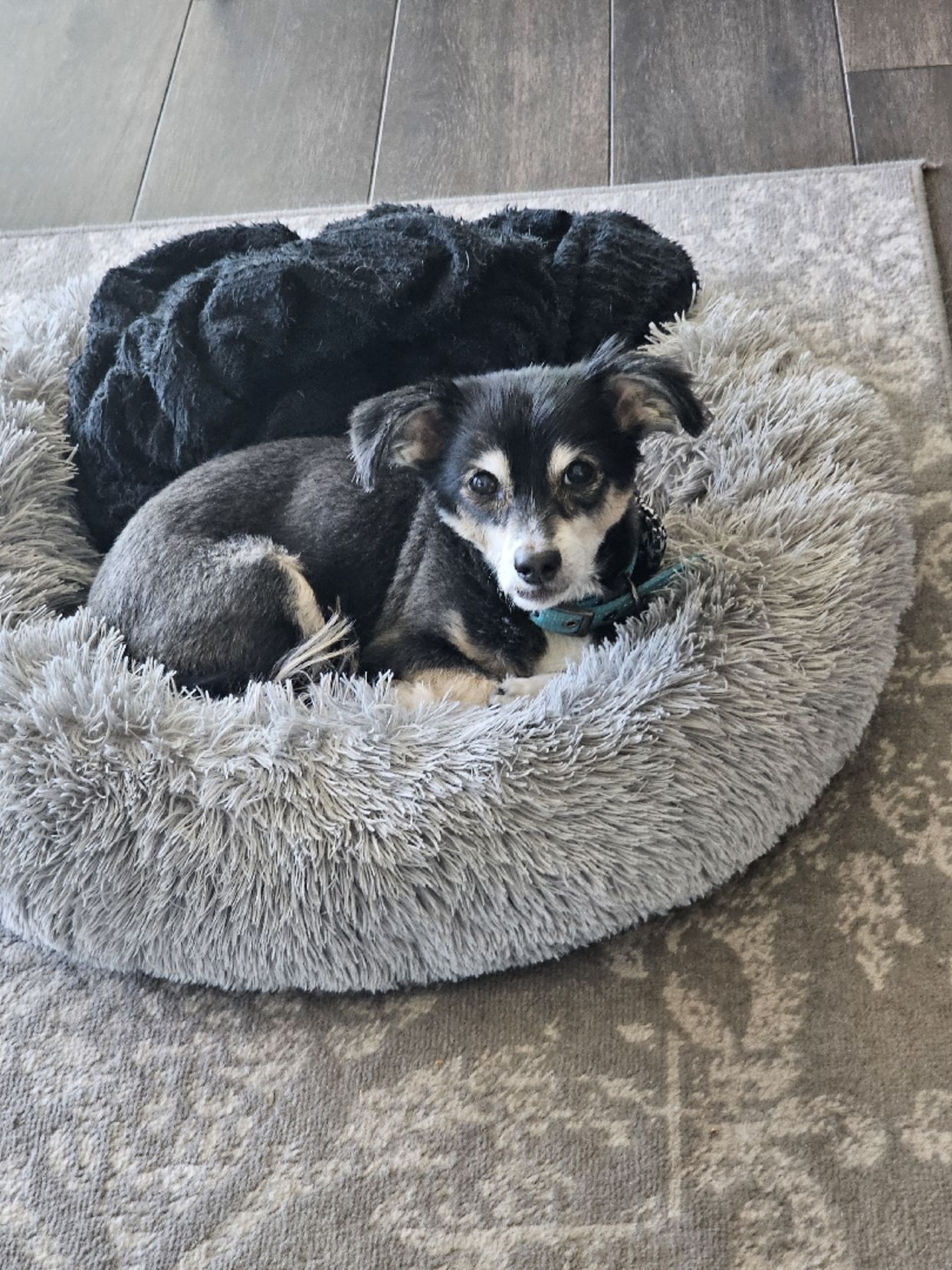 He is i think 14? And very sweet and very mellow most of the time ,he is a mystery mutt,we dont know what he is,but we think theres a daschund in there somewhere (cant see it in the pic well but he has a bit of a daschund body) my personal bet is some kind of long haired chiweenie brcause of the chihuahua face. He just got his hair cut so he went from a scruffy little guy to sleek and smooth