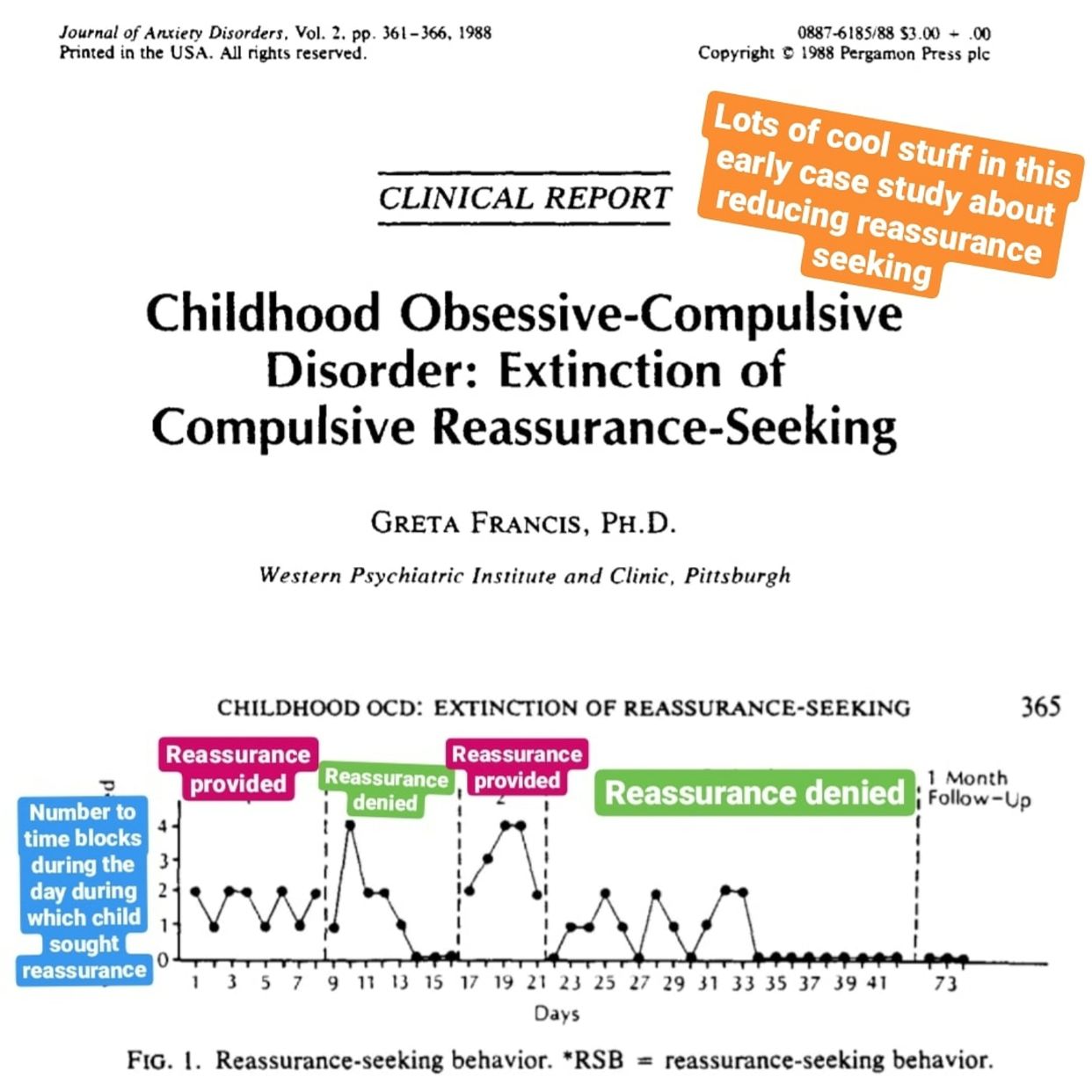 Only, there's a catch. He didn't actually collect any data. So, fast forward to 1988, a doctor named Greta Francis has an 11yr old male client with OCD. He fears a variety of illness and death. Multiple times a day he asks his parents questions like "will I throw up today?" "will I die today?" "am I going blind?" or "do I have a tumor?". Francis decided to implement the treatment Hallam wrote about... But to collect data while doing it.