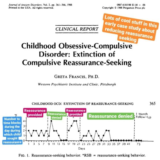 A clinician named Hallam in 1974 identified reassurance seeking as a common compulsion in pediatric ocd. He described inpatient treatment of a 15 yr old female with OCD who sought reassurance regarding her social status, appearance, and whether others were gossiping about her. At first, unit staff were trained to respond to her questions by saying "I can't answer that" or "that question is a ritual". However, her ocd persisted in seeking reassurance. After realizing that the clinical approach wasn't working, the treatment team tried a new strategy-not responding to the questions at all. Instead, they turned their head/body away from met momentarily, and then redirected the conversation onto another topic. Hallam stated that this protocol dramatically reduced the number of questions she asked. Success!!!