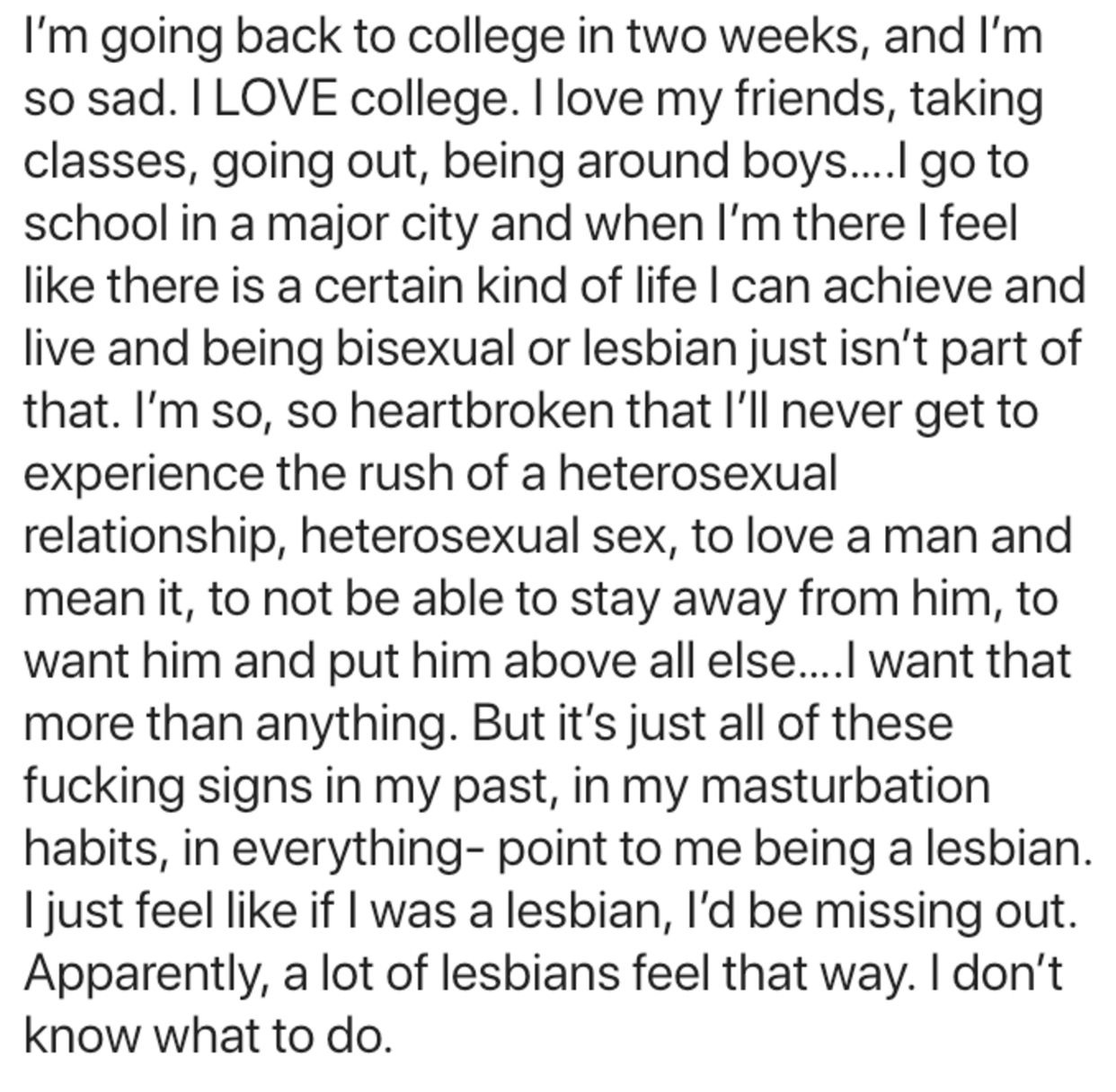 I struggle with the same fear. Try to think positive - maybe going back to college will take your mind off it where you will stop or reduce compulsions - I know if I’m busy / having a good time sometimes it reduces. I struggle with that same fear everything pointing to me being lesbian and then feeling sad about it, I know you said a lot of lesbians feel that way but remember that is them and not you. You are two different people